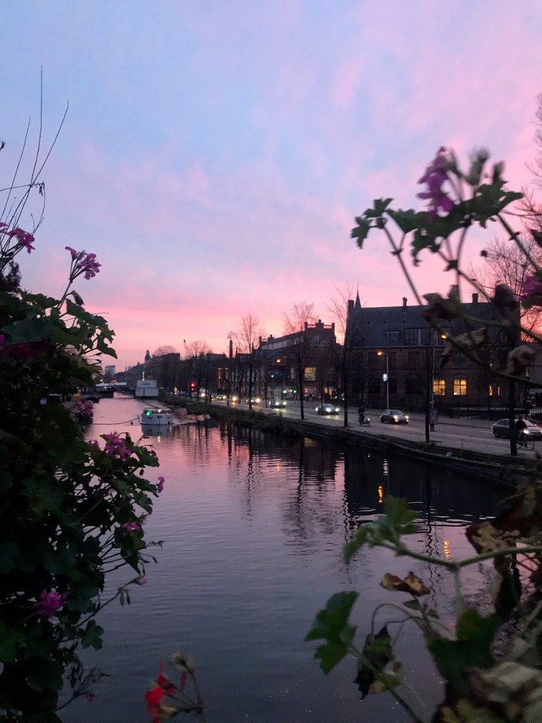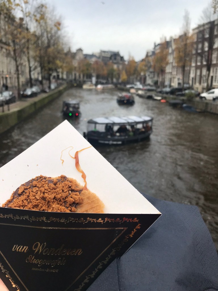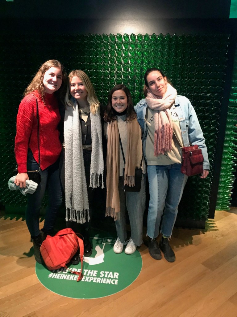 From there, we went on a scheduled canal tour through Amsterdam. It was an hour long canal tour where we got unlimited (you guessed it!) Heineken and wine and got some historical context about the city. It was beautiful getting to go down the canals that you see on almost every street in the city center. It was incredibly cold, but we got blankets and bundled up when we sat outside. The only caveat was that the bathroom on board the canal tour boat was coincidentally broken that day, so by the end of the tour, people were getting antsy as one could imagine. After the canal tour, we decided to bar hop again as our final farewell to Amsterdam. We went to a lot of different bars and ~coffeeshops~ along the way. We ended our night getting fresh waffles at Mama Pancakes, thus completing the dessert trifecta (Dutch pancake, stroopwaffle and waffle) and in one day… My stomach wasn’t happy the next morning, but I’d say it was worth it. We finally made it back home around 2am and had to wake up at 5am the next morning for our 7:40am flight, and lemme tell you that we were not happy campers checking out of our hostel. People were still up and about in the hostel playing pool and drinking and smoking, which seemed so crazy to me! As we walked to the airport bus, we saw so many people ambling about the streets and it was hard to tell if the people on the streets were on their way home or if they had just woken up, haha.